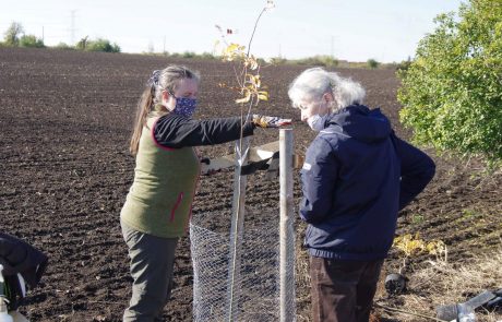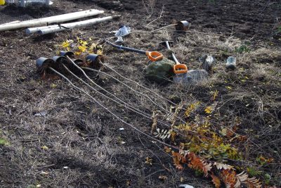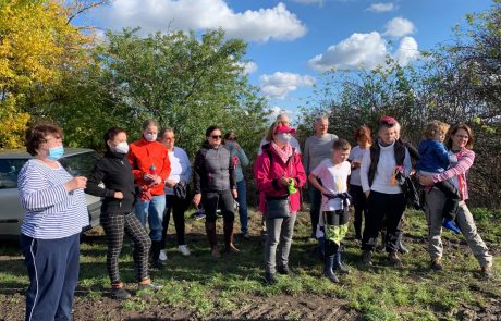A že to byla výzva, panečku! Jen si zkuste s rouškou na obličeji zatlouct do země mohutný dvoumetrový kůl. Navíc bucharem, který váží úctyhodných 15 kg! Každý vysazený stromek potřebuje jako nutnou oporu takové kůly nejméně dva! Naštěstí vzdálenosti mezi stromy souhlasily s akceptovanými „rozestupy“ a rodinné týmy, které v naší brigádě převažovaly, směly pracovat bez roušek.